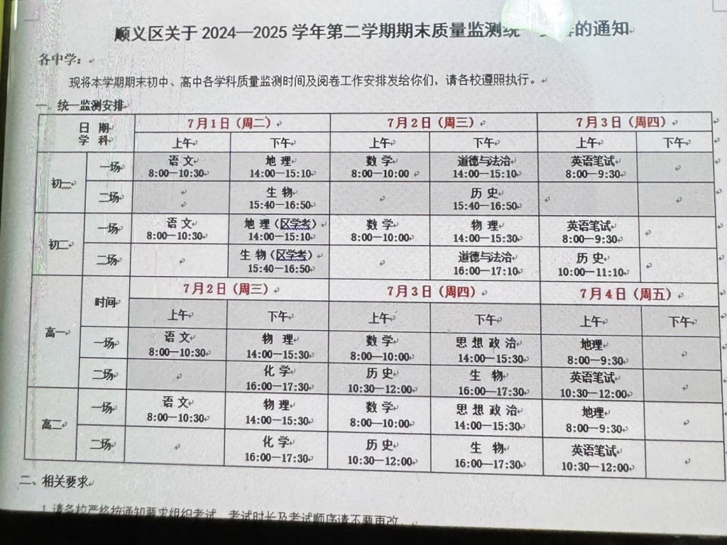 admw360教研组整理了北京顺义2025初一初二下学期期末考试安排,分享给大家啊。