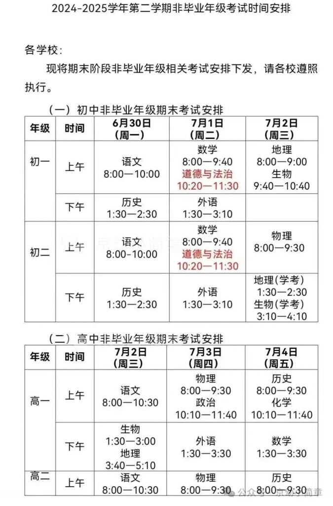 北京西城2025初一初二下期末考试安排发布,admw360教研组整理了相关内容,分享给大家: