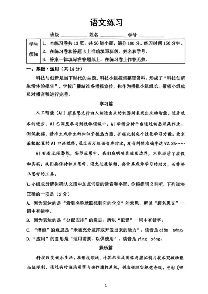 2025北京中考即将来临,admw360教研组整理了2025北京四中初三三模语文试题,分享给大家: