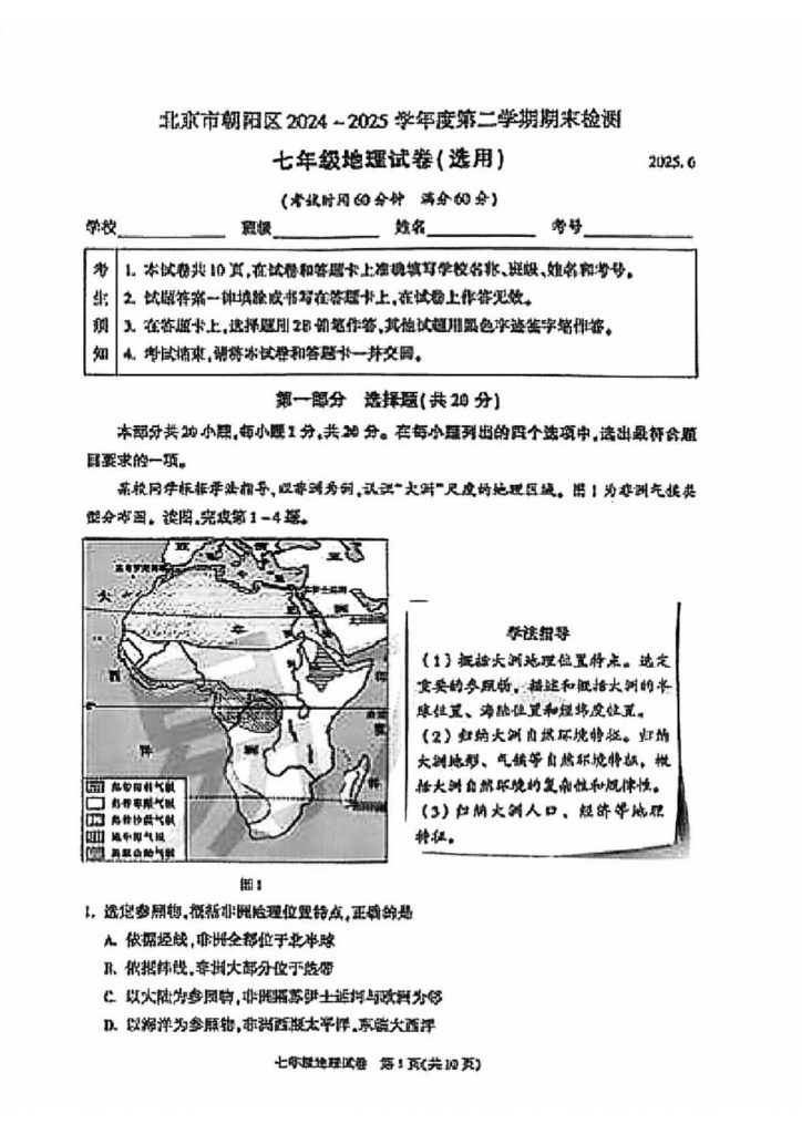 2025年北京各区初一(下)期末考已陆续开始进行,admw360教研组整理了2025朝阳初一(下)期末地理试题及答案,分享给大家。