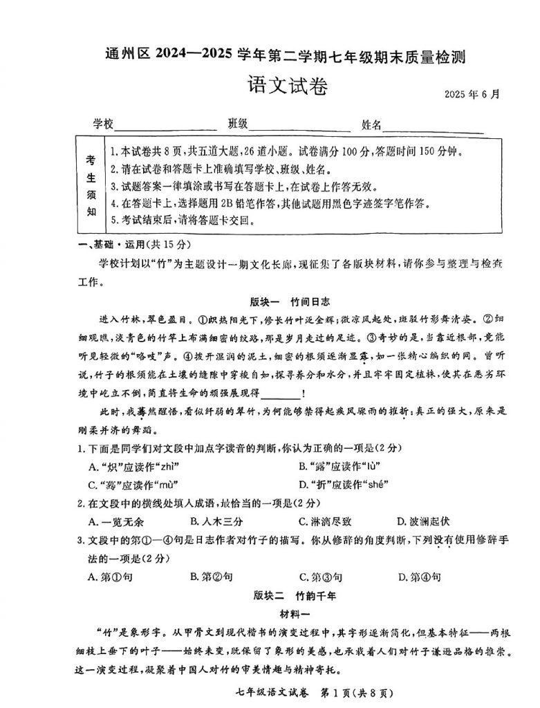2025年北京各区初一(下)期末考已陆续开始进行,admw360教研组整理了2025通州初一(下)期末语文试题,分享给大家。