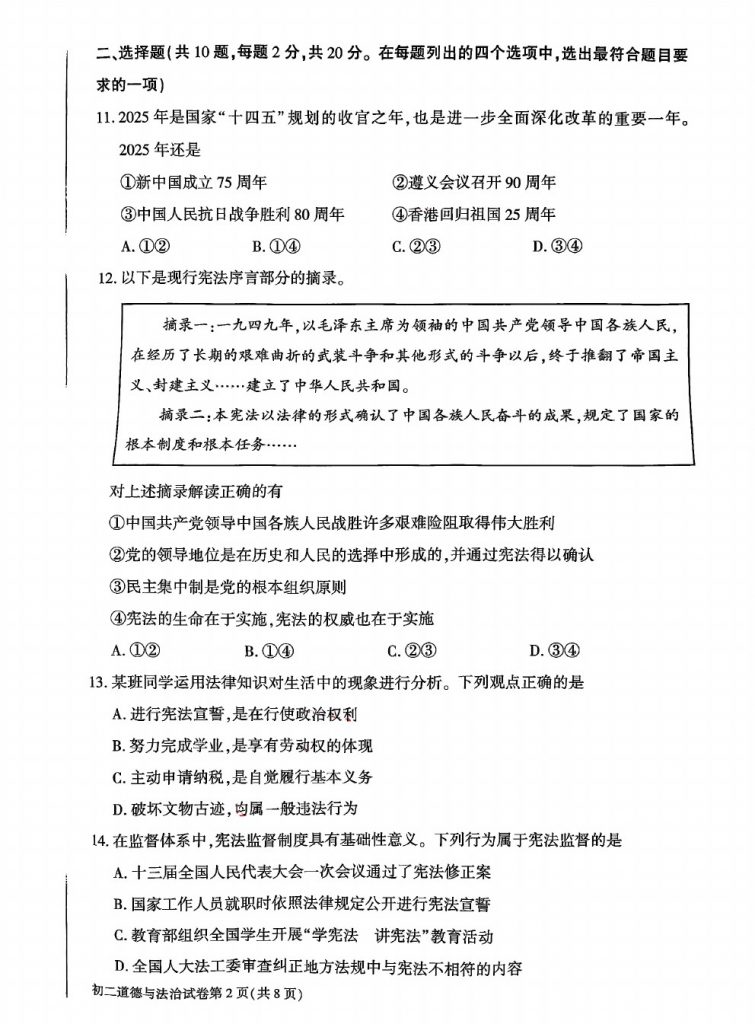 2025年北京各区初二(下)期末考已陆续开始进行,admw360教研组整理了2025大兴区初二(下)期末道法试题及答案,分享给大家。
