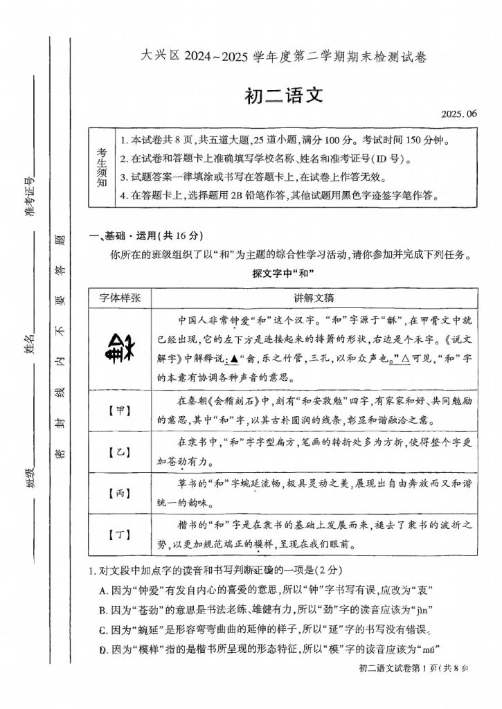 2025年北京各区初二(下)期末考已陆续开始进行,admw360教研组整理了2025大兴初二(下)期末语文试题及答案,分享给大家。