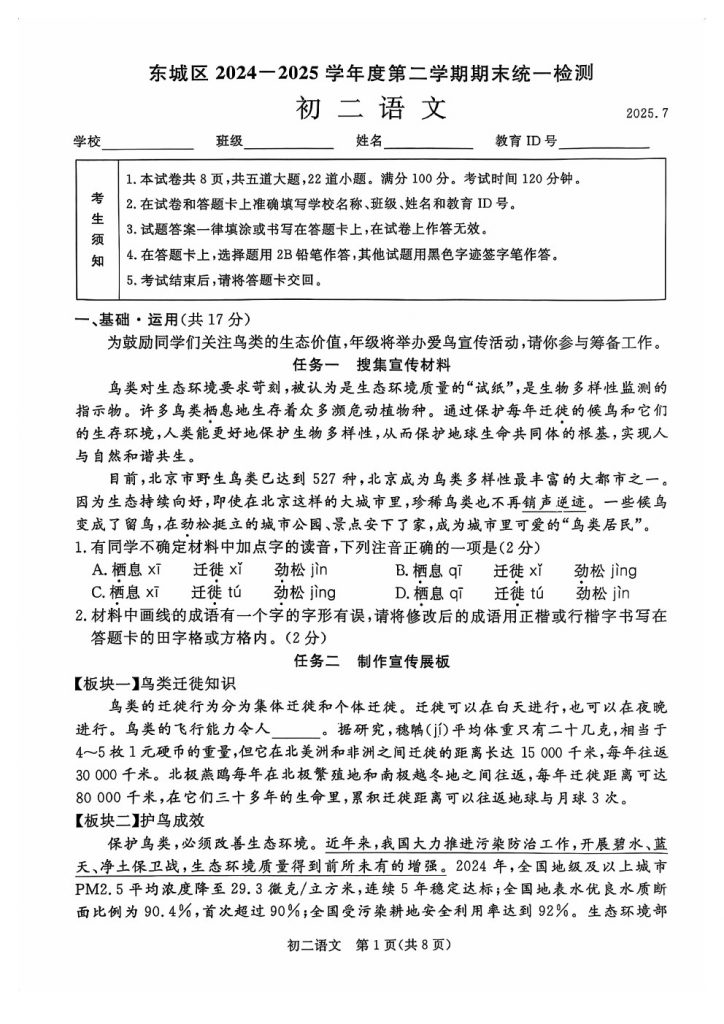 2025年北京各区初二(下)期末考已陆续开始进行,admw360教研组整理了2025东城初二(下)期末语文试题,分享给大家。