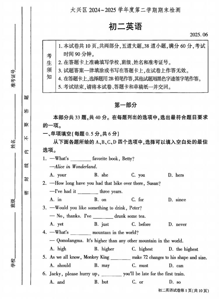 2025年北京各区初二(下)期末考已陆续开始进行,admw360教研组整理了2025大兴初二(下)期末英语试题及答案,分享给大家。