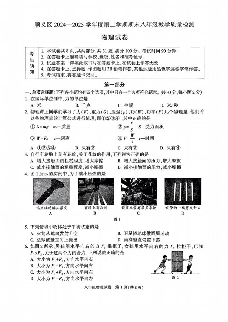 2025年北京各区初二(下)期末考已陆续开始进行,admw360教研组整理了2025北京顺义初二(下)期末物理试题,分享给大家。