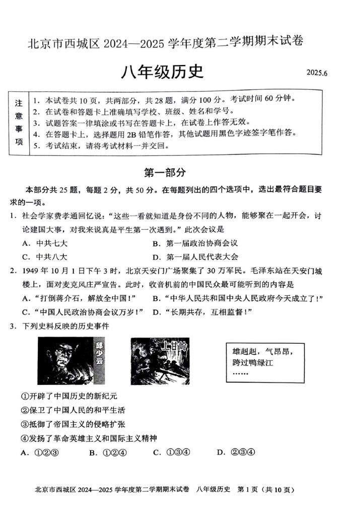 2025年北京各区初二(下)期末考已陆续开始进行,admw360教研组整理了2025西城初二(下)期末历史试题及答案,分享给大家。