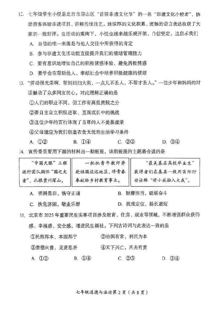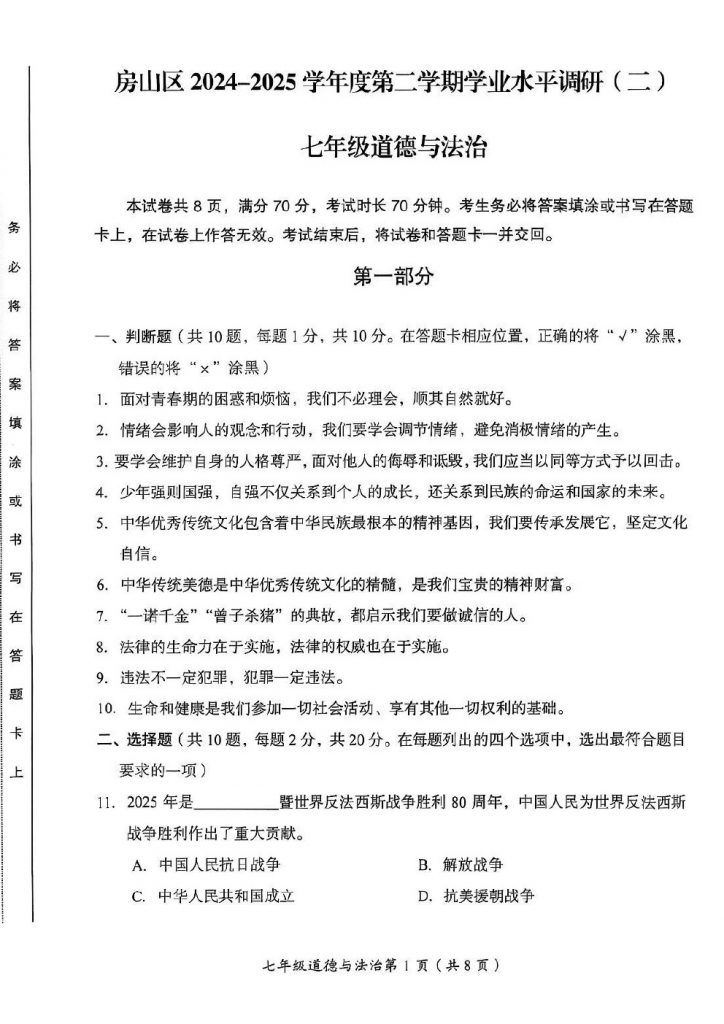 2025年北京各区初一(下)期末考已陆续开始进行,admw360教研组整理了2025北京房山初一(下)期末道法试题,分享给大家。