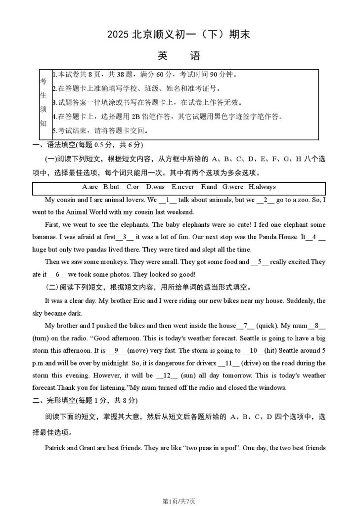 2025年北京各区初一(下)期末考已陆续开始进行,admw360教研组整理了2025北京顺义区初一(下)期末英语试题,分享给大家。