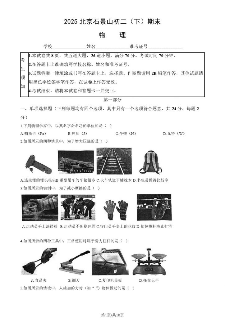 2025年北京各区初二(下)期末考已陆续开始进行,admw360教研组整理了2025北京石景山初二(下)期末物理试题及答案,分享给大家。