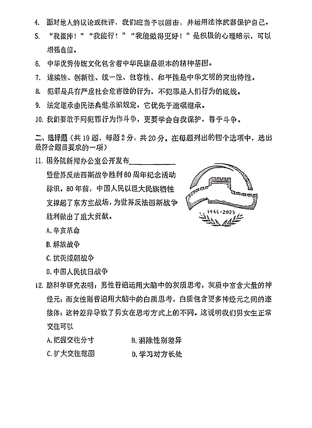 2025年北京各区初一(下)期末考已陆续开始进行,admw360教研组整理了2025北京二中初一(下)期末道法试题及答案,分享给大家。