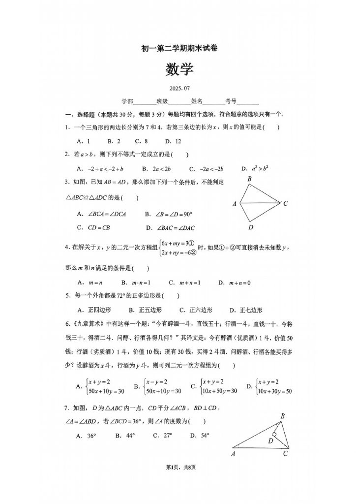 2025年北京各区初一(下)期末考已陆续开始进行,admw360教研组整理了2025北京清华附中初一(下)期末数学试题,分享给大家。
