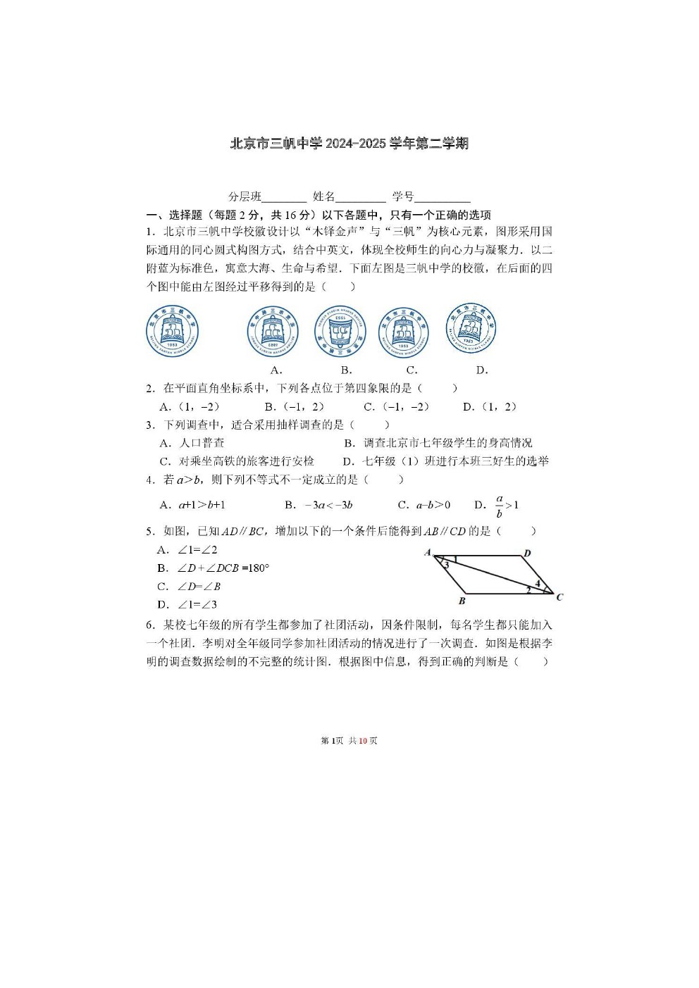2025年北京各区初一(下)期末考已陆续开始进行,admw360教研组整理了2025北京三帆中学初一(下)期末数学试题,分享给大家。