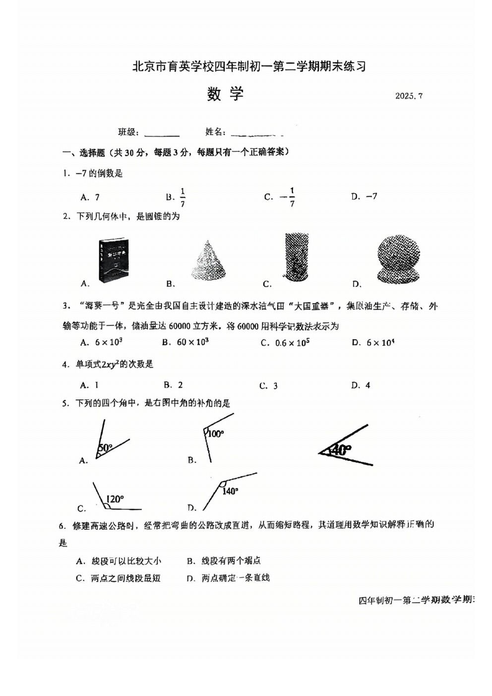 2025年北京各区初一(下)期末考已陆续开始进行,admw360教研组整理了2025北京育英学校初一(下)期末数学(四年制)试题,分享给大家。