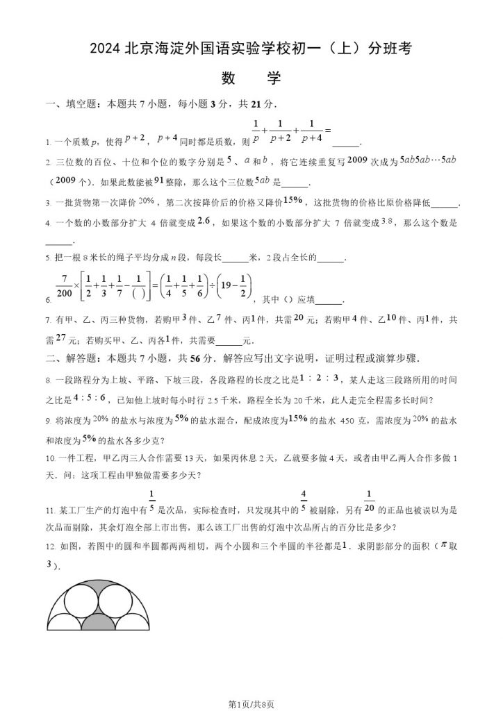 admw360教研组整理了海淀外国语实验学校2024初一分班考数学试题及答案,分享给大家,同学们做题练习后可结合参考答案进行估分。