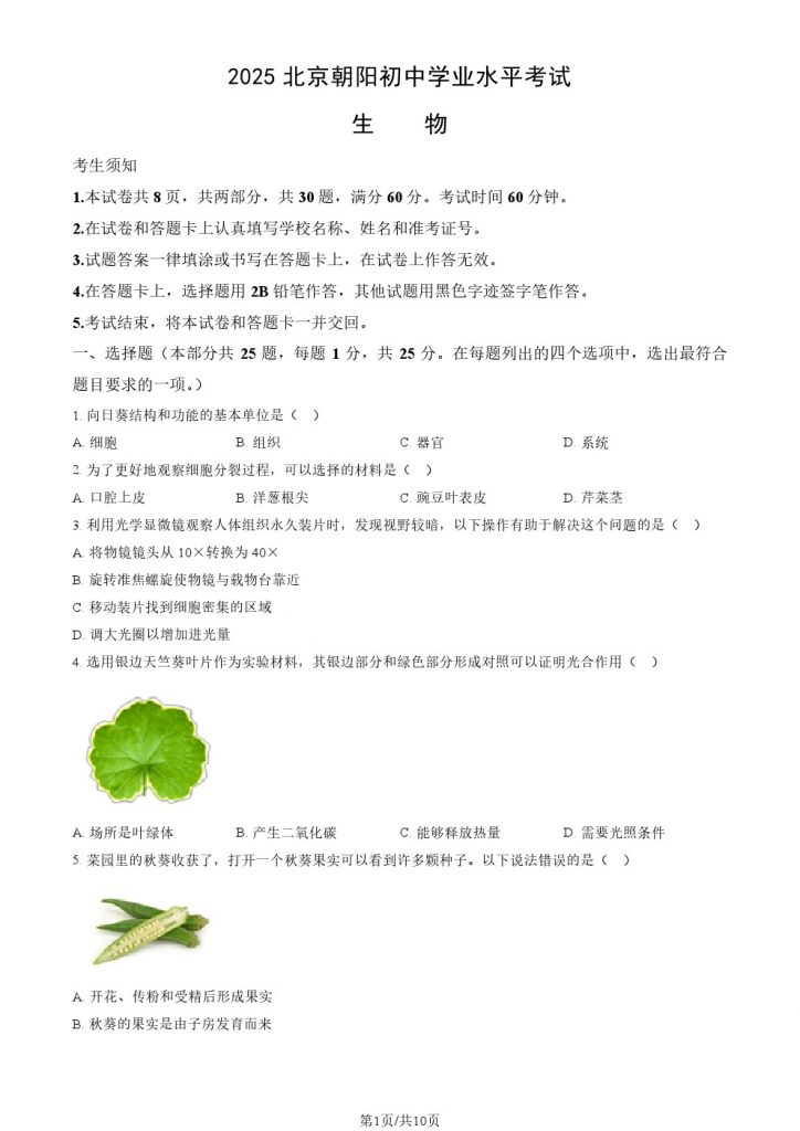 admw360教研组整理了北京朝阳区2025初中学业水平考试生物试题及答案。供大家参考,欢迎转发分享!