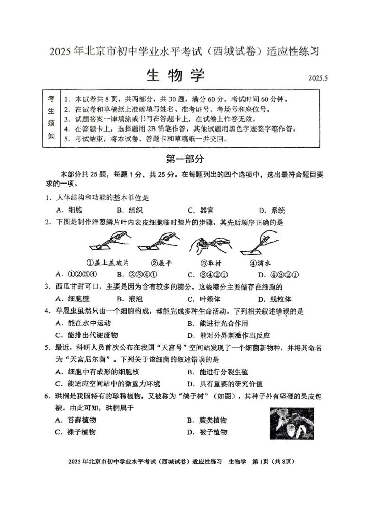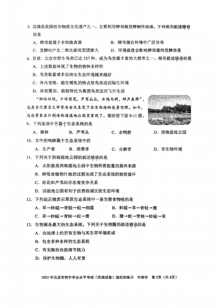 admw360教研组整理了2025北京西城区初二二模生物试题及答案。供大家参考,欢迎转发分享!