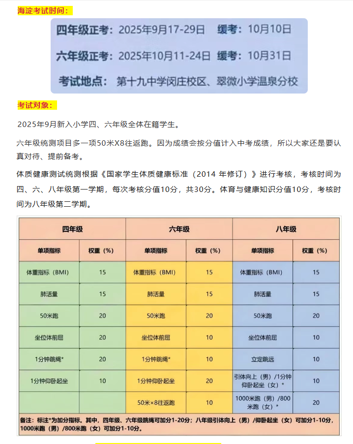 北京四六八年级体测成绩纳入中考总分,日前海淀区公布四六年级体测时间,新学期开学后进行体测,专家支招体测满分两大重点,具体情况随我们一起来看,新学期升入4/6/8年级的家长提前了解!