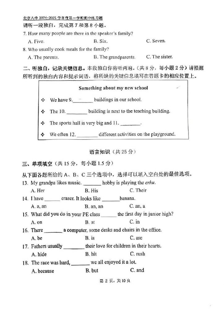 为方便大家对答案、下载练习等小编整理了2024北京八中初一(上)期中英语试题及答案,需要的小伙伴赶紧下载练习起来吧: