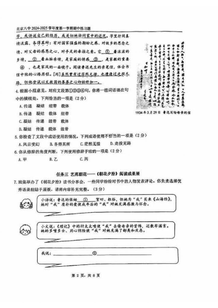 首页 初一试题 2024北京八中初一(上)期中语文试题及答案