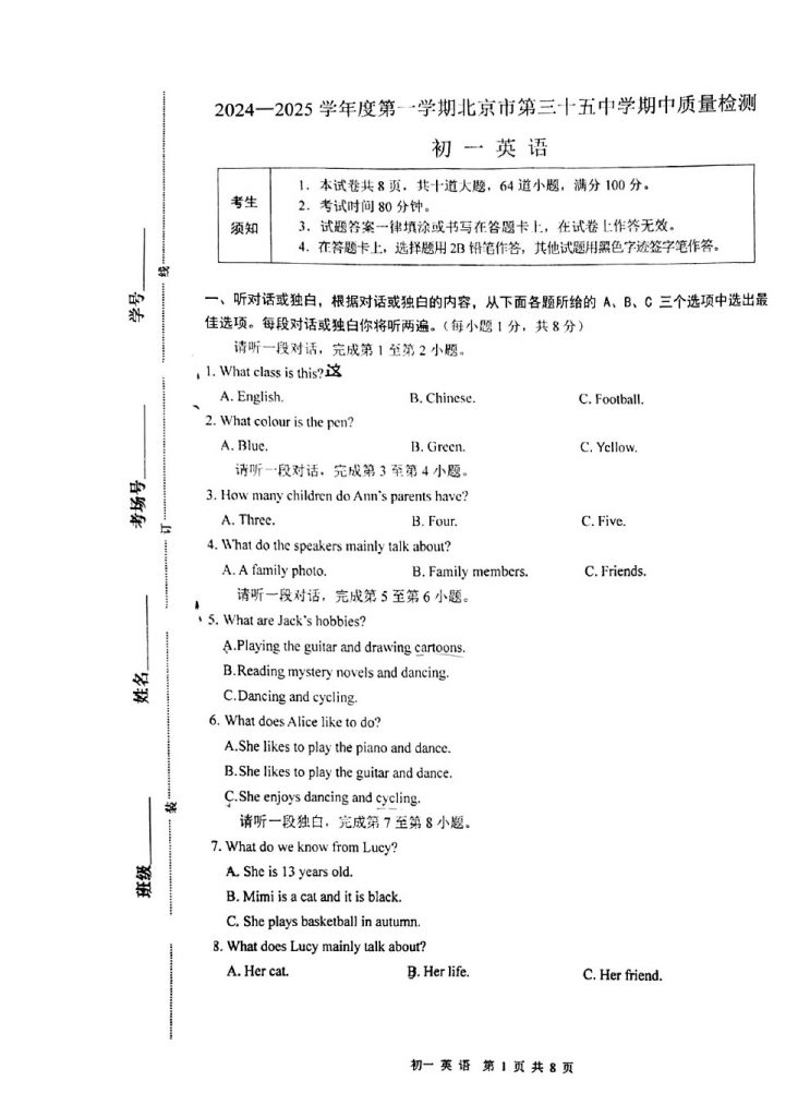 为方便大家对答案、下载练习等小编整理了2024三十五中初一(上)期中英语试题及答案,需要的小伙伴赶紧下载练习起来吧: