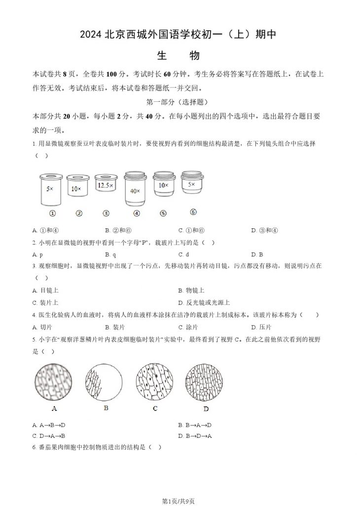 为方便大家对答案、下载练习等小编整理了2024北京西城外国语学校初一(上)期中生物试题及答案,需要的小伙伴赶紧下载练习起来吧: