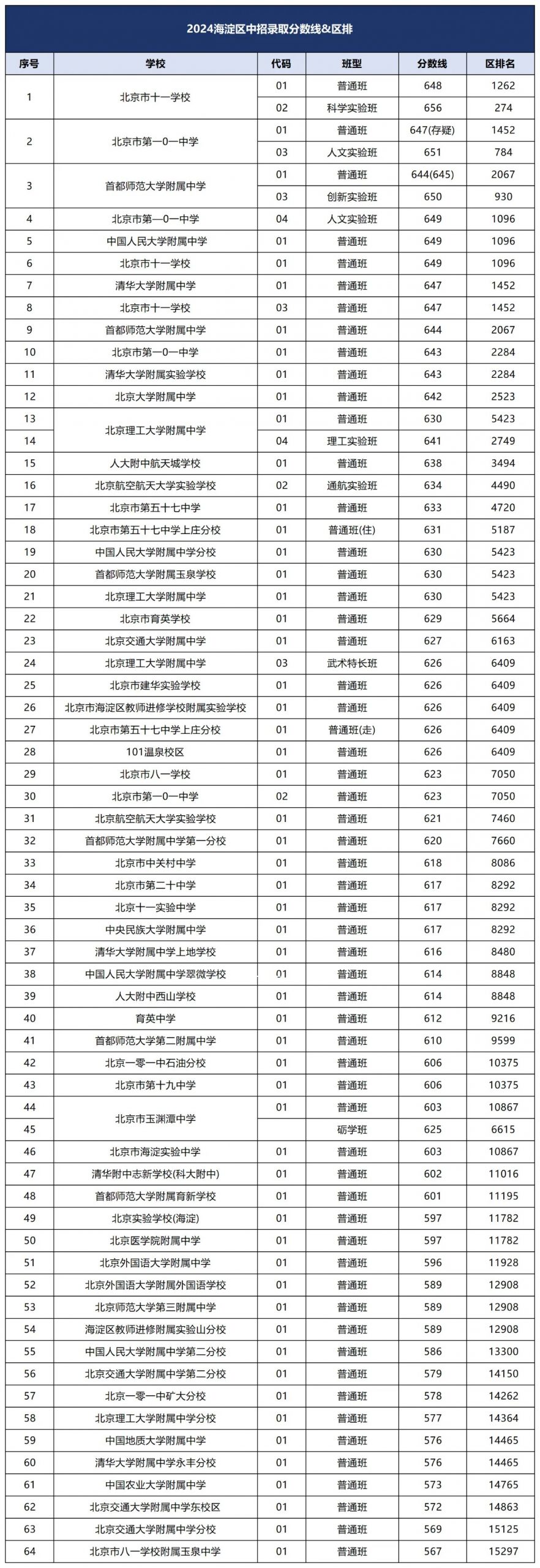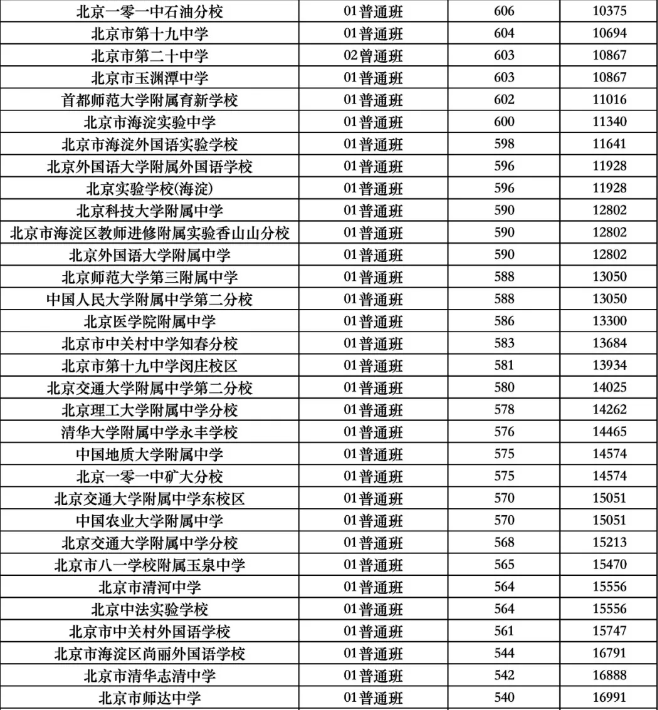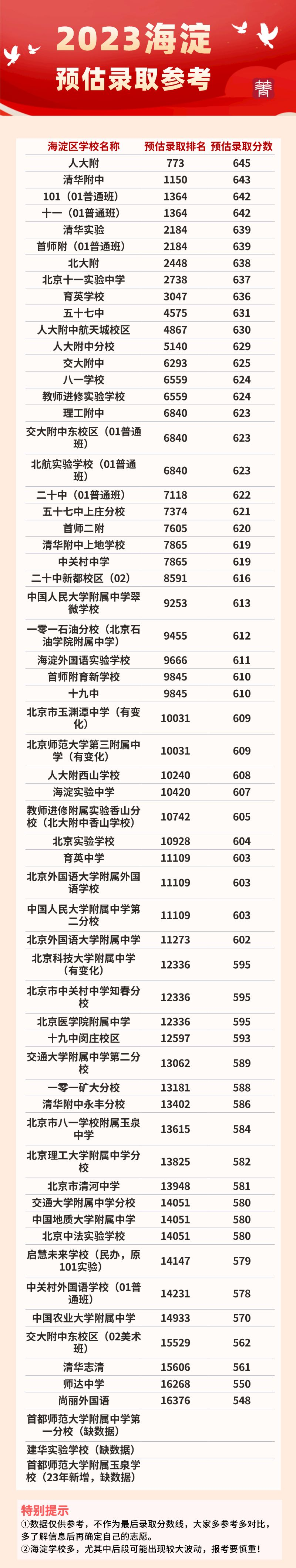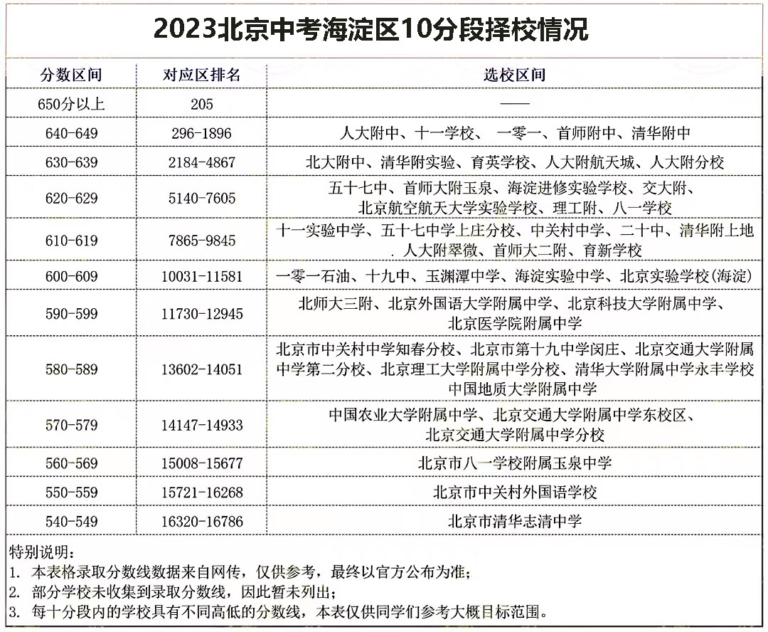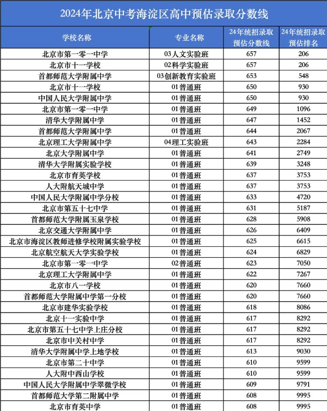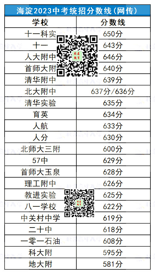 平均录取分数线640分以上的学校——海淀区4所(人大附、十一学校、一零一、清华附)