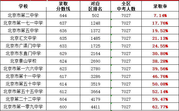 由上表来看,东城区的北京二中录取率为7.14%,作为东城区的老牌优质校,发挥依旧稳定,2023年网传版录取分数线644,比排名第二的一七一中学高了7分。