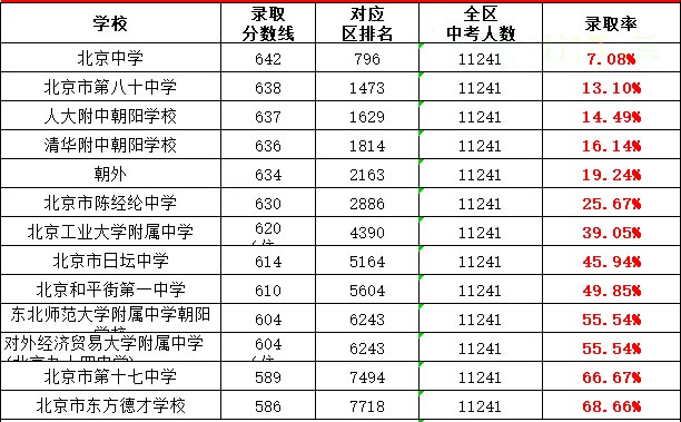 朝阳区的北京中学自2021年开始在统招批次进行招生,录取分数线一直居朝阳区榜首,2023年它的录取率属朝阳区的最低7.08%。北京中学今年统招325人,其中包括特长生和国际班。