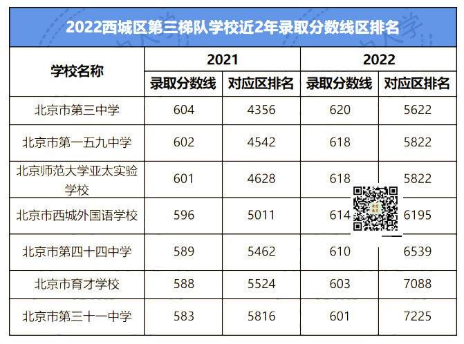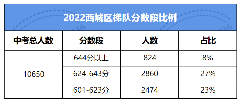 2022西城区第三梯队共有7所学校,录取分数在分到601-623分之间的考生有2474人,占比23%。这部分学校适合成绩在中游的考生参考选择。