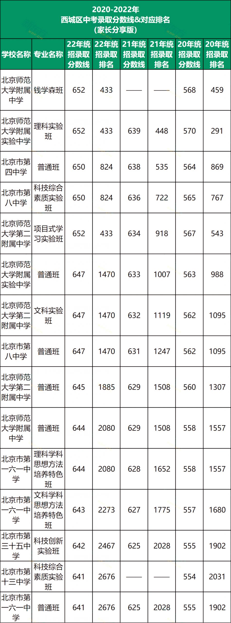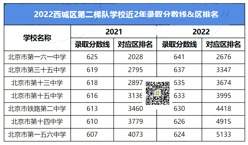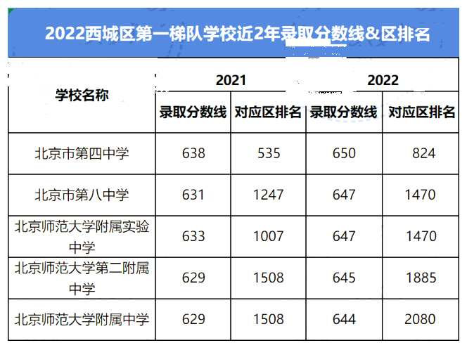 2022年西城区第一梯队包含西城四金刚及北师大附中,想要考近西城区第一梯队录取分数线在644分及分以上,录取考生排名大约在2080名左右。