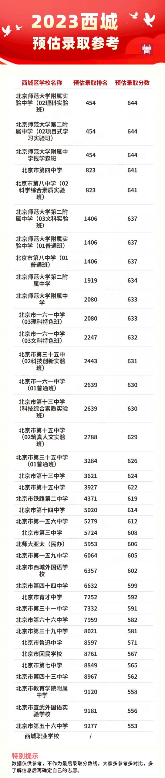 由上表来看,东城区的北京二中录取率为7.14%,作为东城区的老牌优质校,发挥依旧稳定,2023年网传版录取分数线644,比排名第二的一七一中学高了7分。