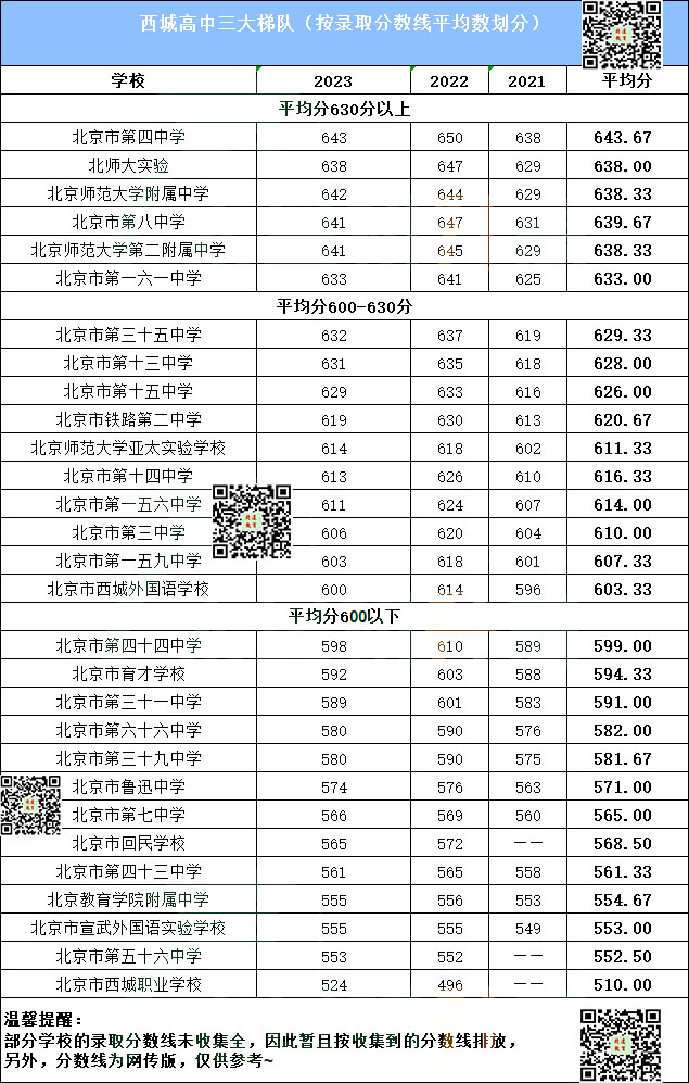 根据西城区各分数段比率和西城区学校的中考录取分数线,我们将西城区学校主要分为三个梯队: