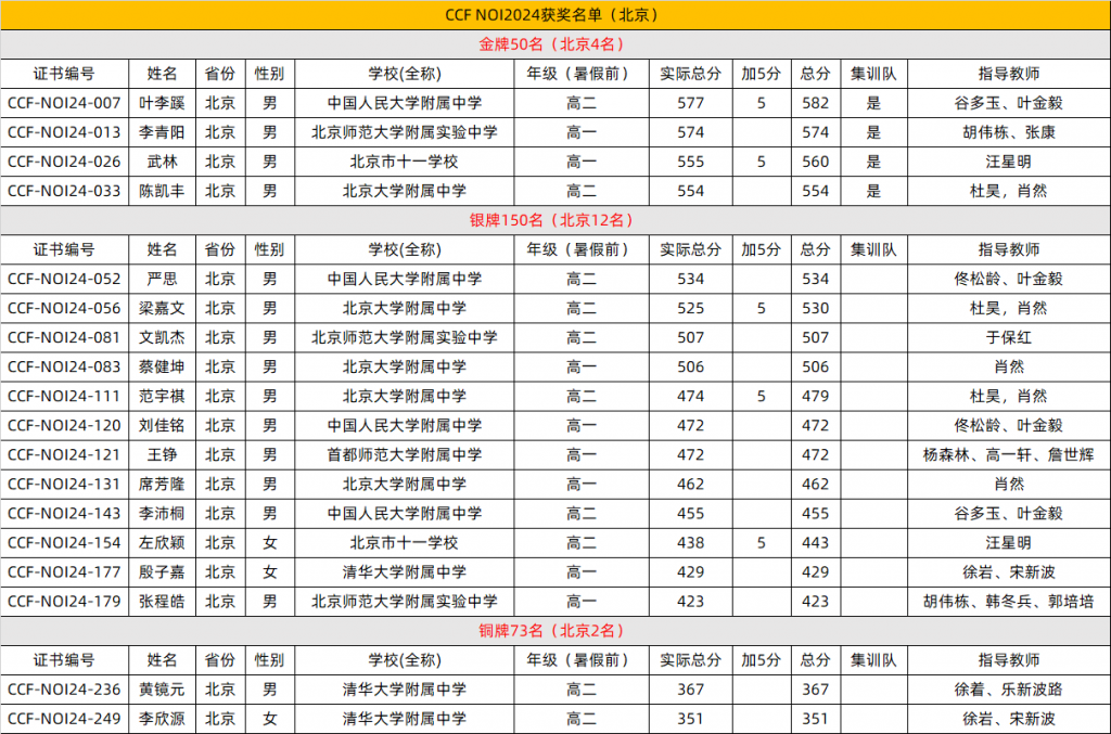 本届NOI共吸引了众多顶尖学子参与,最终有50名选手脱颖而出,荣获金牌并入选国家集训队,获得宝贵的保送资格;同时,150人摘得银牌,并因此获得强基计划破格入围资格;此外,还有73人凭借出色的表现赢得了铜牌。值得注意的是,北京地区的学子在本次竞赛中表现尤为突出,共斩获4枚金牌、12枚银牌及若干铜牌。