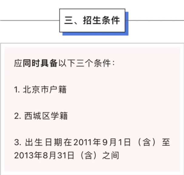 1.本市外区转入:需同时具备“西城区个人居民户籍且法定监护人(学生父母)在西城区有独立产权住房(提供法定监护人独立拥有的《房屋产权证》或《不动产权证书》)”。