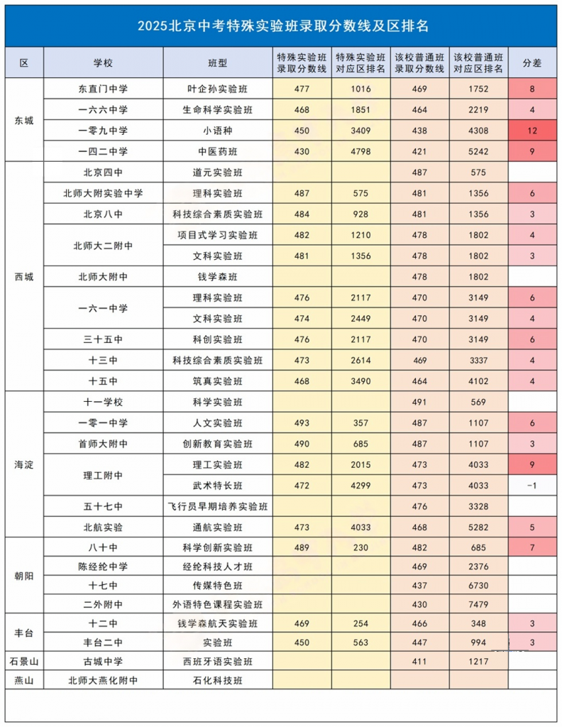 2、今年特殊实验班与普通班分差最大的是东城区一零九中学,小语种班与普通班分差达到12分。其次是一四二中学的中医药班和理工附中的理工实验班,与普通班分差均达到9分。