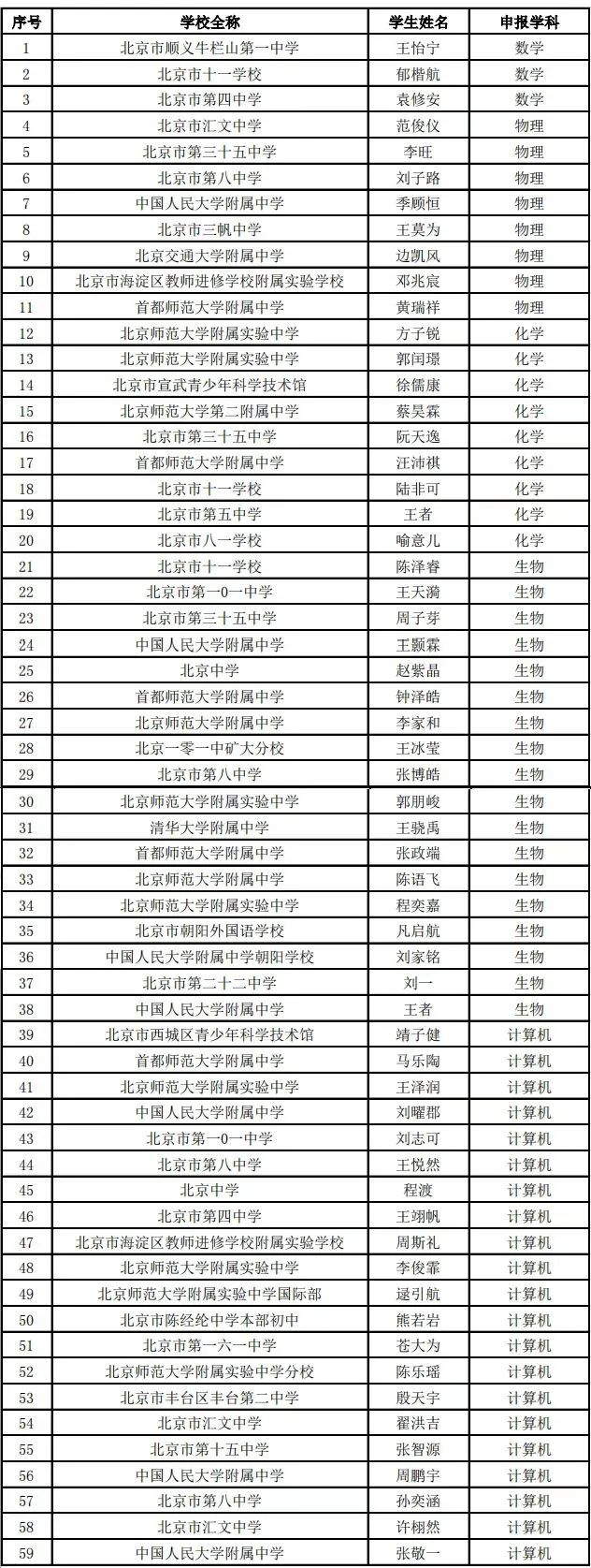清华大学附属中学、北京师范大学第二附属中学、中国人民大学附属中学朝阳学校、北京五中、三帆中学、北京交大附中、一六一中学、陈经纶中学本部初中、北京师范大学附属实验中学分校、北京师范大学附属实验中学国际部、北京十五中、八一学校、朝阳外国语学校、北京二十二中、丰台二中、一零一中矿大分校、牛栏山一中、西城区青少年科学技术馆、宣武青少年科学技术馆,分别有1位同学入选。