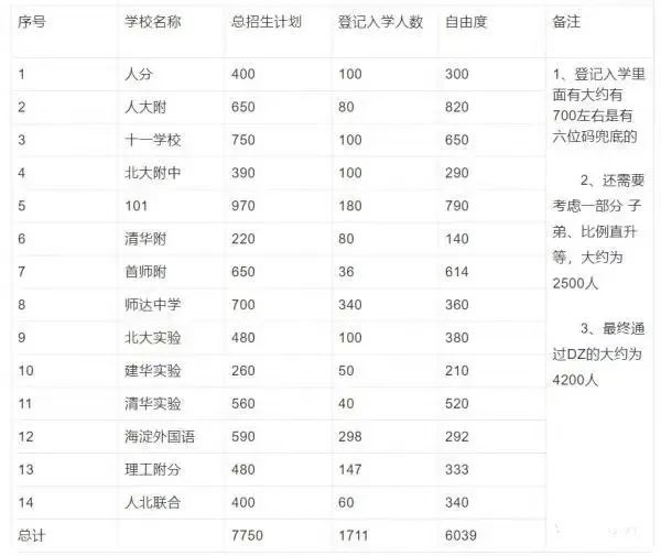 表里统计的数据,大概看了一下,海淀六小强总的自由度是3300人,如果再加上自己附属实验学校和几个民办学校规模达6000多人。据多个教育自媒体大V表示这个数据基本还算靠谱,唯一就是人大附这个有点疑问,当然不知道统计数据的是从哪几方面统计的,估计了一下820是不是还包括早培和一些集团校游学的人数,这样貌似就合理了。当然随着去年民转公,像人分、建华、理工附分等学校最后也要参与派位,所以自由度应该还要有所减少。