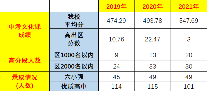 100%学生中考成绩500分以上,优秀率100%,总平均分超530,540分以上高分段学生超三分之一