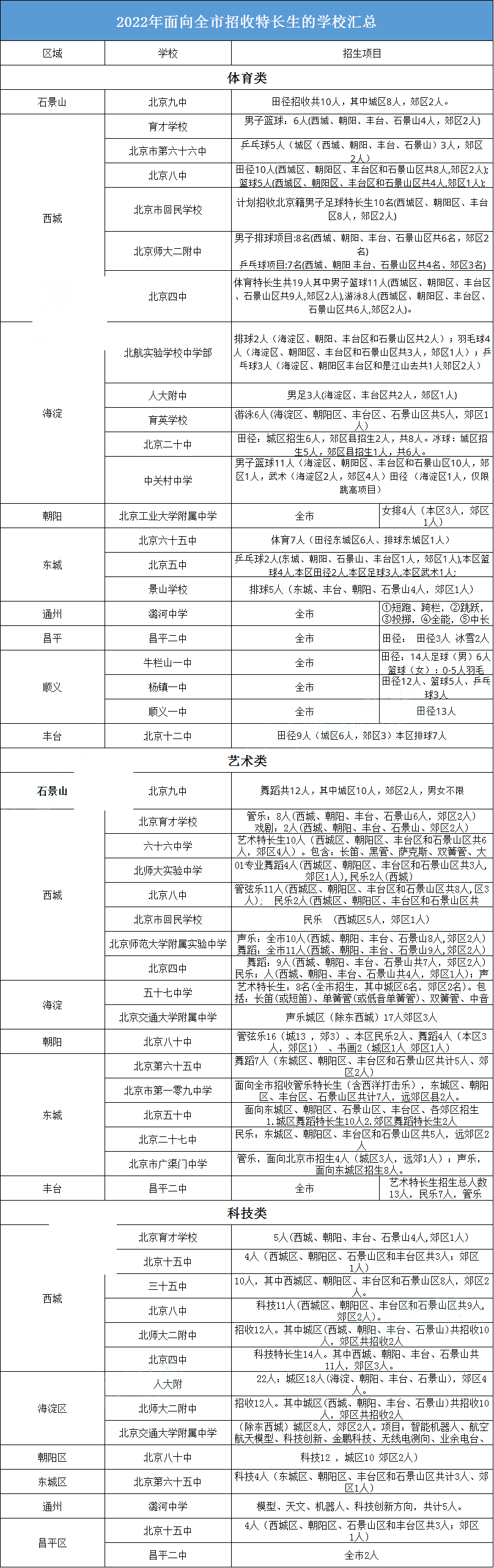 从2022年起,北京市招收体育、艺术特长生的学校,每一类特长生招生计划比例控制在本校当年招生计划总数的4%以内,科技特长生招生计划比例控制在本校当年招生计划总数的3%以内,各类特长生招生计划不可通用。体育、艺术及科技特长生每类招生计划总数不能超过上一年计划数。