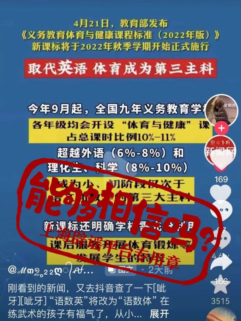 “教育部最新通知:体育将取代英语成为主科,今年9月开始实施,此后‘语数英’将改为‘语数体’。”该消息还带有教育部新闻发布会的照片,是真的吗?