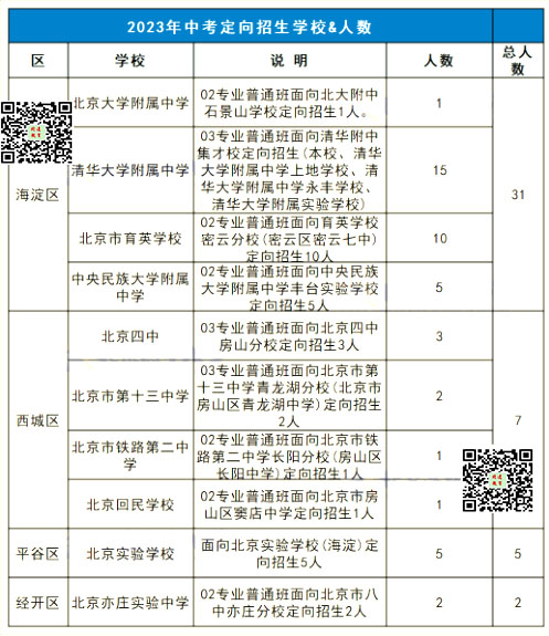 2023北京中考定向招生的高中校和2022年相同,但是在招生指标上,中央民族大学附属中学较去年减少了10个名额;西城区的回民中学较去年减少了1个名额。2024北京中考生请知悉~