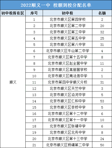 2022年顺义一中有337个校额到校名额,分给了顺义31所学校。详细分配名额见上表↑↑