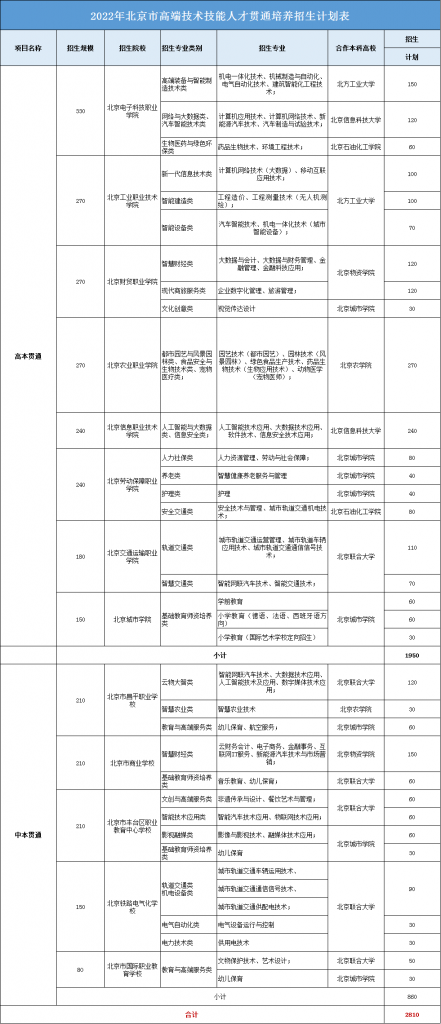 2021年北京中考贯通培养项目拟招2810人,其中高本贯通招生1950人,中本贯通项目招生860人。