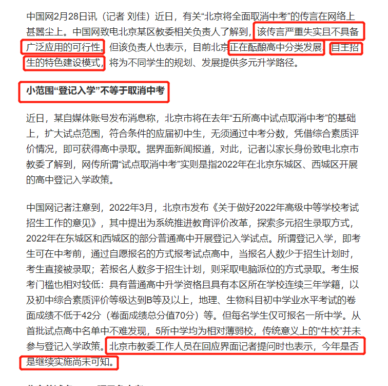 2月28日,中国网发布一则新闻《“北京将全面取消中考”系误读 业内人士:正酝酿高中自主招生》,提到了有关2023北京中考、1+3项目、登记入学等升学消息。