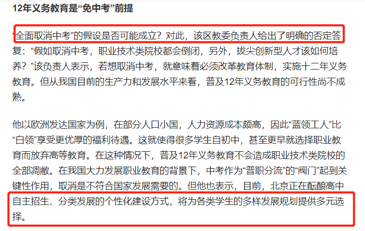 某区教委负责人的回应打破了近期网络上的传言,但不可忽视的是,高中分类发展、自主招生等将为不同学生的规划发展提供多元的升学路径。