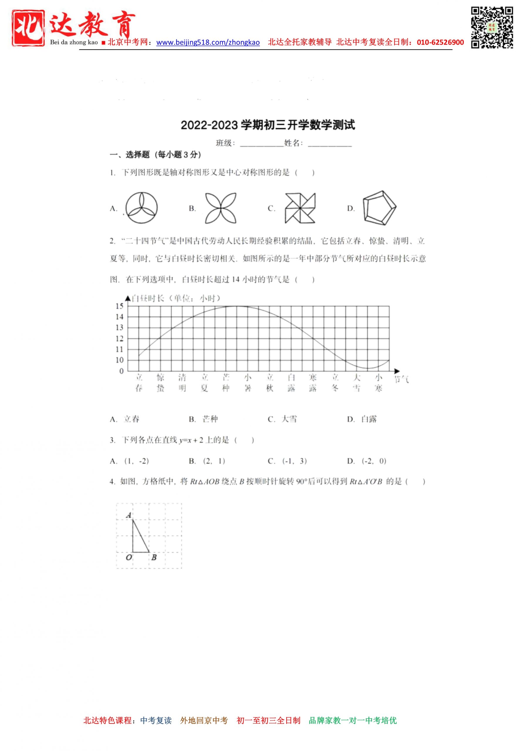 2022-2023学年北京市日坛中学九年级(上)数学开学测试试卷.pdf