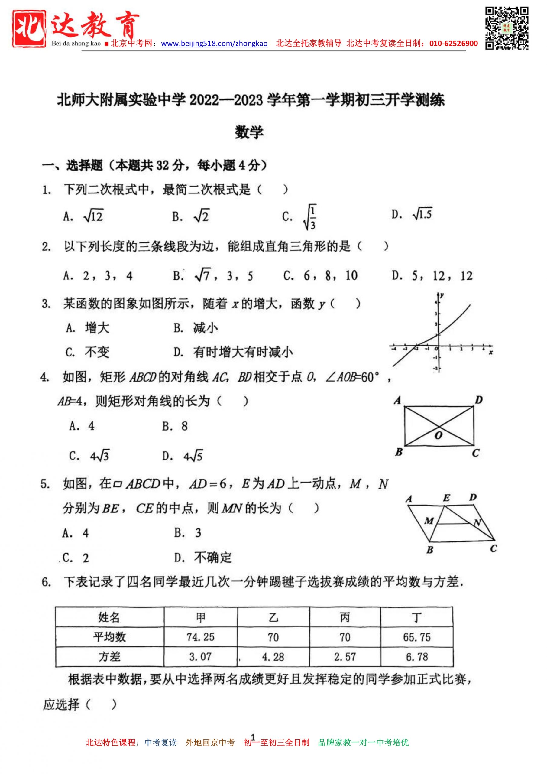 2022-2023学年北京市海淀区首都师大附中九年级(上)开学数学试卷.pdf
