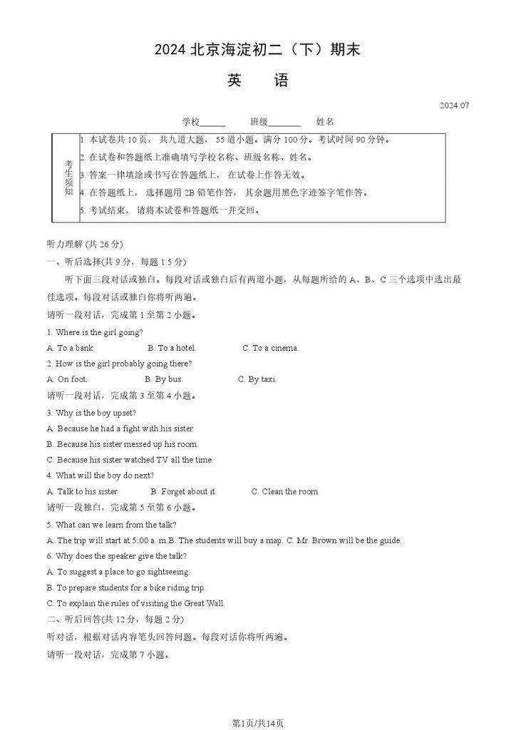 2024北京海淀区初二下期末考试已开始,小编为大家收集整理了相关科目的试卷,需要的同学可自行下载。