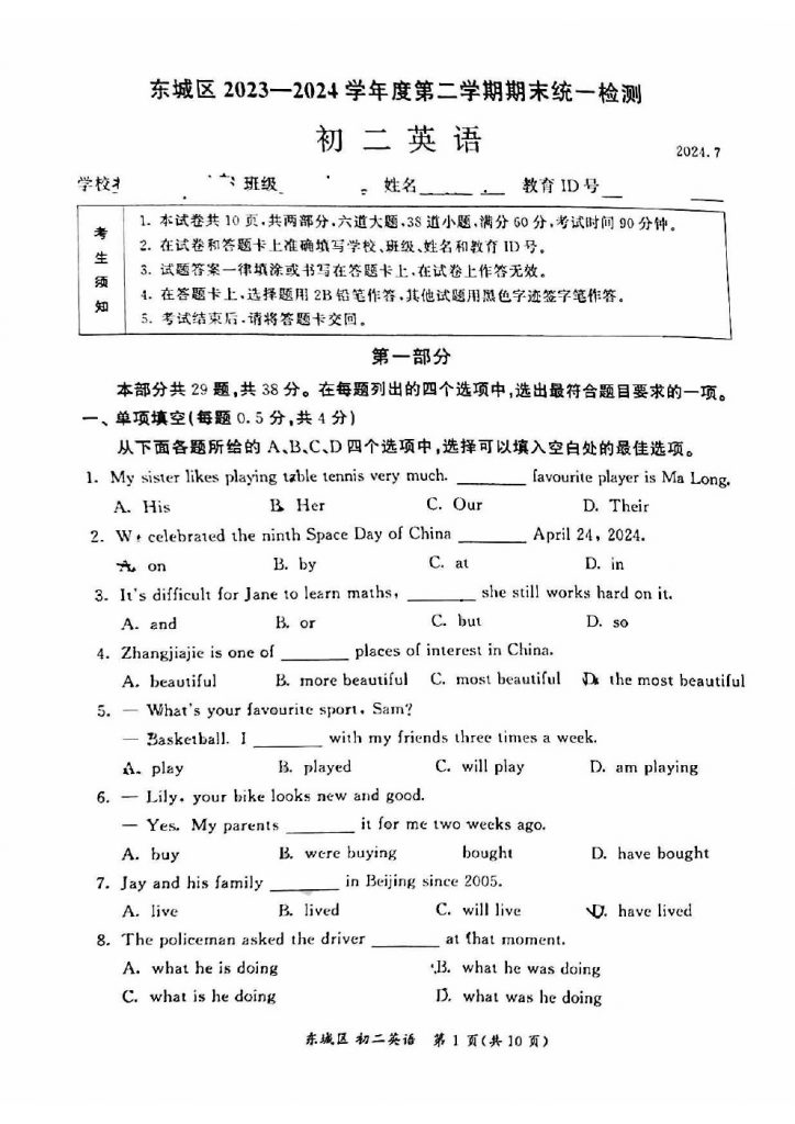 2024北京东城区初二下期末考试已开始,小编为大家收集整理了相关科目的试卷,需要的同学可自行下载。